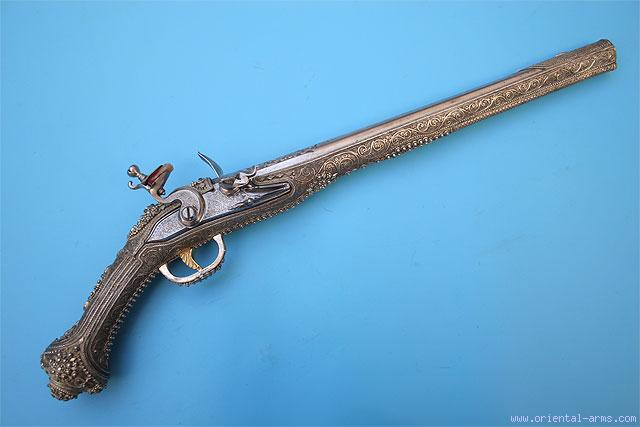 This flintlock pistol is Turkish, early to mid 19 C. Very well made barrel, finely chiseled and engraved. Lock, probably of European origin is finely engraved and is in perfect working order. The entire stock is covered with very finely silver filigree work set with coral stones. Gilded trigger. Length 21 1/2 inches. Very good plus condition. |