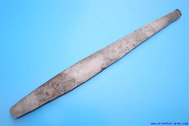This is a rare and original 18 C. steel ingot from India, made of wootz, already partially forged to a long ingot shape, ready to be traded and forged into a wootz blade. 2005 Grams weight, 22 1/2 inches long, 1– 21/2 inches wide and 10mm thick. One of the sides is marked with an armory mark. Unique piece for the weapon collector, steel researcher or blade smith expert. |