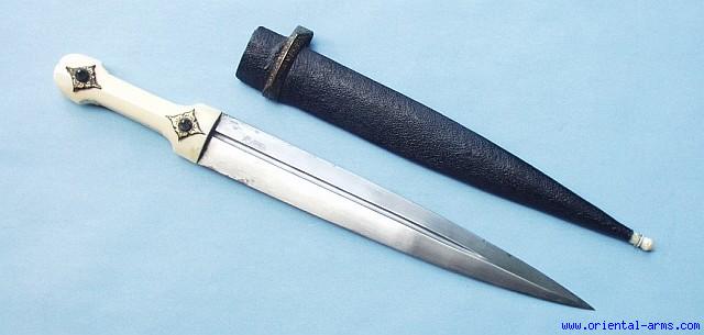 This is a very good Kindjal dagger of high quality and condition. Classical blade 11½ inches long with off-centered fullers, solid walrus ivory grip mounted on the blade tang with two big rivets. Both rivets and rivet bosses are decorated with gold koftgari work. Wood scabbard covered with the original black leather and fitted with steel belt band, also decorated with gold koftgari work. The scabbard tip is bone. Very good condition. All parts original – No restored or replaced parts. Very attractive item of quality offered here at a very reasonable price considering its quality and materials. |