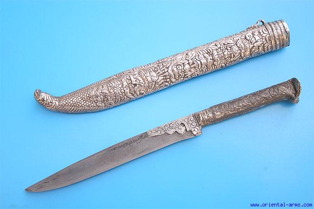 This short knife in the shape of a small Yataghan is of Turkish origin, early to mid 19 C also known as Bichaq. its single edge blade is 8 inches long, finely forged from pattern welded steel in the pattern known as Turkish Ribbon, made from two layers of twisted steel bars. The Handle as well as the scabbard are made of silver plated pewter. Total length 13 inches. Very good condition. The silver plating of the handle is almost erased,