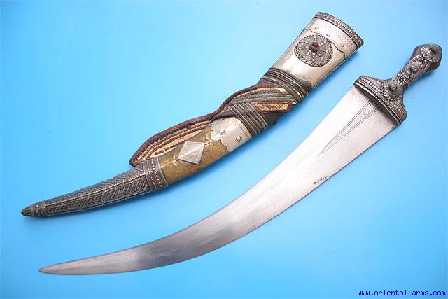 This type of long Jambiya dagger is common in the Western regions of Arabia, Hijaz and Asir. Sometimes it is referred to by collectors as Wahabite style. The one offered here is of rather large dimensions. The blade is plain, 20 inches long, 3 inches wide (compared to 14 – 16 inches more common blades). The handle is made of two rhino horn grips richly decorated with filigree silver mounts. The scabbard is brass, with big white metal locket and silver chape, also richly decorated with filigree work and set with red colored stone (glass ??). Total length 26 inches. This dagger comes with parts of its original leather belt. Very good condition. |