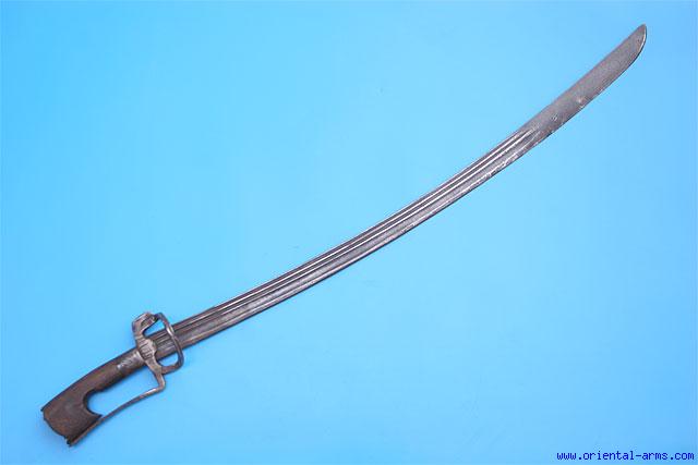 A very unusual and interesting Arab sword. It reminds the famous Moroccan “NIMCHA” but although the hilt style is similar, this sword is coming from Yemen, and it is believed to be produced in the island of Zanzibar in the 19th C. The single edge blade is 30 inches long with three fullers, a European trade blade marked with a maker name of which only SOHN are legible. The grip is cut and shaped from a solid black horn. The special design of the hilt is typical to swords produced in Zanzibar, and has a big steel ring forged in one piece with the cross guard and the “D” guard. Total length 36 inches. Good condition. Original age patina on the blade with lightly pitted areas. Chips on one side of the horn grip. This is a real fighting sword and from exotic part of the world. Very Low Price |