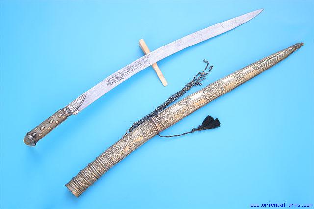 This style of yataghan with wide T shaped pommel ears are believed to come from central Turkey. This one has a blade of 24 1/2 inches long, engraved with Arabic inscription inside a styled sword image and a maker mark on the other face. Grip bound with twisted silver wire and a 5 inches wide pommel from chased silver. Steel bolsters forged in one piece with the blade covered with pewter. Finely chased low silver scabbard with silver chains and short tassel. Total length 33 inches. Very good condition. |