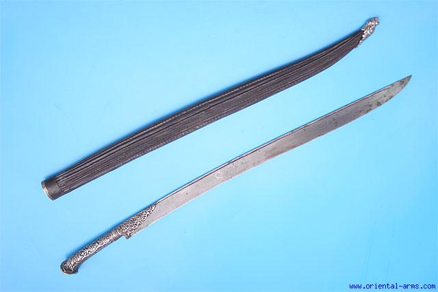 This Yataghan is dated in silver inlay on its blade tp 1227 (1812 in the Gregorian calendar). Classical blade shape 26 inches long richly decorated with silver inlay (true inlay) with inscription in Arabic letters, date and floral decoration. Chased silver handle and bolsters (with silver proof mark). Wood scabbard covered with tolled leather with silver locket and heavy lion shaped silver tip. Total length 32 ½ inches. Very good condition. The leather cover is a later replacement. |