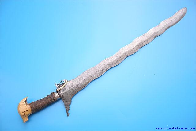 This Moro kris sword is mid to late 19 C. with wavy blade 21 inches long, forged from laminated steel core forge welded to high carbon steel edges. Grip with thread binding and elephant ivory pommel of good age color. One brass clamp of the blade to the handle. Total length 26 inches. Very good condition. Very good age patina on the pommel. Minor blackened points on the blade. |
