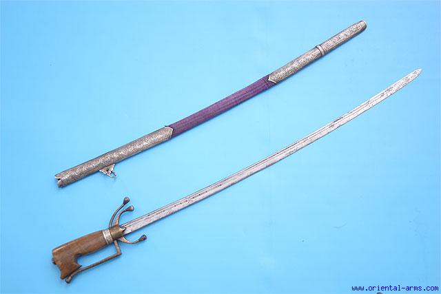 Up for sale is this fine Nimcha sword from Morocco, employing a very good blade, 31 inches long. The blade is marked ANDREA FERARA the famous 16 C. Italian sword maker. However we can not guaranty that this one is one of his blades. His markings were copied during many centuries and on many blades and it is more a mark of quality for the blade rather than an actual maker mark. So are the eyelashes marks on the blade. The handle is carved from a massive piece of rhino horn with clear fibrous structure set with chiseled silver collar. The hilt guard and down curving quillons are steel with gold koftgari work. The scabbard is wood covered with the original violet velvet and mounted with long finely chased silver locket and chape, both proof marked 336 and 3, most probably standing for the year 1336 (1917 in the Gregorian calendar). Total length 38 inches. A fine piece of quality in very good condition. |
