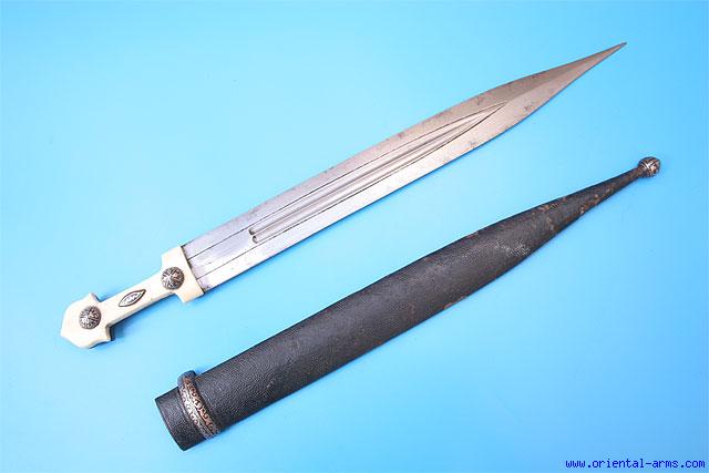 Late 19 or early 20 C. most probably Dagestani, with nicely fullered and etched blade. Bone and horn gris with steel rivet bosses with silver inlay work. Original leather covered scabbard with steel belt ring and tip also inlayes with silver decoration. Blade length 14 1/1 inches. Total length 20 inches. Very good plus condition. |
