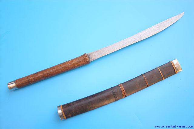 Up for sale is this good Dah short sword / long knife, Probably Burmese, early 20 C. 13 inches blade of good qualit. 9 inches long two handed handle bound with braided rattan rings and silver pommel cap. Wood scabbard bound with rattan bands and silver mounts. Total length 23 inches. Very good condition. Very low price. |