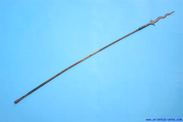 Jarid is the Indian name for the throwing spear (or Javelin) . This one is a Jarid of unusual blade and fine decoration. The wavy blade is 7 inches with a 2 ½ inches socket. The thin wood pole is finely painted. Total length 40 ½ inches. Very good condition. |