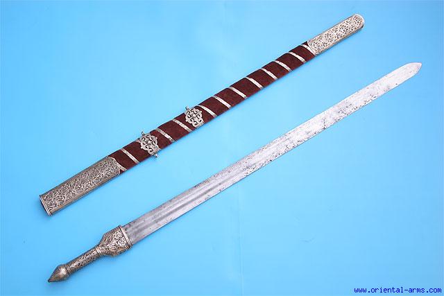This sword is a very rare variant of Yemenite sword, with a straight blade and a style following the early 13 - 14 C. Islamic sword. The blade is 17 C. or even earlier, of European origin. The handle and scabbard fittings are chased silver with spiral silver strip bound on the scabbard. Blade length 32 inches. Total 42 inches. Very good condition to age. The blade has seen some pitted spots which were cleaned long time ago, leaving very few small holes in the fuller. Minor loss to the silver locket on the back. Other dents on the silver mounts. The velvet cover is recent. |