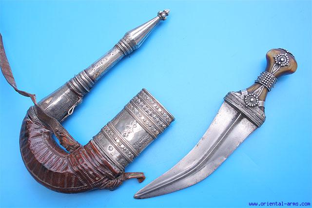 One of the rarest forms of the Arab Jambiya is the Gusbi from Hadramaut, an arid coastal area in the south of Yemen along the Arabian see. Although the blade and handle are similar to those on common Arab Jambiya, the Gusbi is characterized by the considerably up-curving scabbard tip, with the chape (scabbard tip) sometimes higher than the pommel. Here is such a beautiful example of a Gusbi. 8 inches curved blade with a pronounced central rib. I shaped grip cut from rhino horn and mounted with silver decorative mounts. The wood scabbard is covered with tooled leather and mounted with silver locket and chape. This dagger comes with part of its original leather belt. Very good condition. |