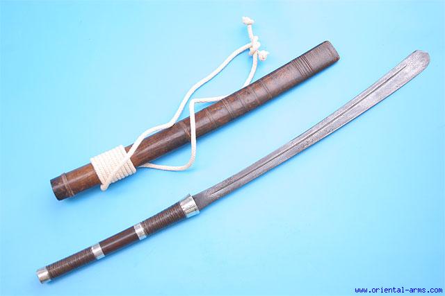 This very good Dah sword is late 19 C. with a finely forged fullered blade, 22 inches long ½ inches thick. Spear point tip. Two handed turned hardwood handle with silver bands. Wood scabbard with braided rattan binding bands. Total length 36 inches. Very good condition. Finem untouched age patina on the blade, with very minor pitted spots. The baldric carrying rope is new. |
