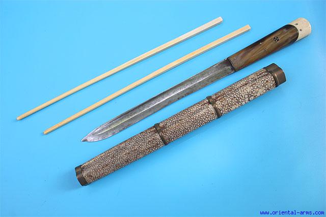 A Chinese ‘trousse’ (eating set), comprising a knife and chopsticks. This type of sets was very common in china and in all the countries under the Chinese influence from Tibet to Mongolia. It was part of a man formal dress up to the turn of the 20th century and usually accompanied with a variety of accessories like pickle spear, toothpicks, tweezers and the like. Similar sets are found in various sizes and quality. This one has a massive 7 ½ inches finely forged and fullered blade, horn grips with bone tops and brass pommel cover. Scabbard is wood covered with Sting Ray skin and brass mounts. Chopsticks are ivory. Total length 13 inches. Very good condition. Impressive set.