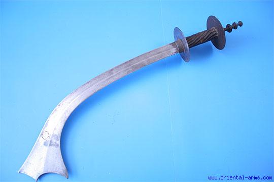 Up for sale is this very good battle / sacrificial Kora sword from Nepal, early to mid 19 C. The heavy down-curving blade is 19 inches long, widening to 5 inches at the tip. The blade is marked with the “bursting sun” talisman near the tip. The handle is all steel bound with braided fiber to ensure good grip, and with disc pommel and cross guard. Three stages pagoda style spike on the pommel. Total length 24 inches. Very good condition. This Kora comes from the collection of John Powell, SF, a world known collection of Nepalese and related weapons.. |