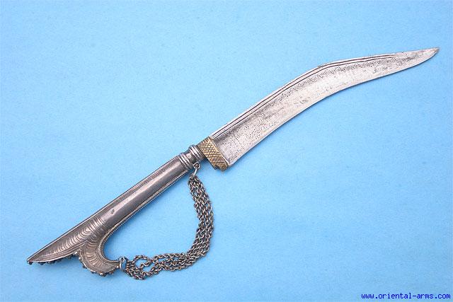 This rare small knife is called in Arabic as Shafra or Kusha. It is carried in attached to the rear side of the wide belt behind the Jambiya (Khanjar) dagger. It is found all over The Arabian peninsula id varying shapes. Here is a fine example: The blade is 6 inches long, down curving with a shallow fuller and simple dot punched decoration. The grip is chiseled and engraved silver with a fine silver chain. Total length 11 inches. Very good condition. No scabbard. It should be noted here that several sources (Stone, Egerton and others) identify this type of knife as Nepali, probably due to the blade shape and curvature. . This Shafra comes from the collection of John Powell, SF, a world known collection of Nepalese and related weapons. It was added to this collection due to the very common misunderstanding mentioned above.