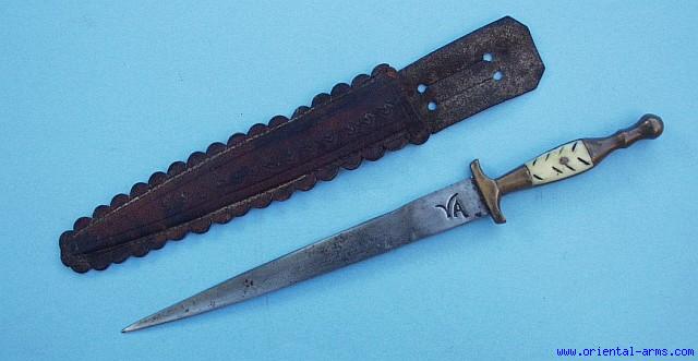 This is a small stiletto dagger probably from Mexico. 7 inches signed blade, brass hilt set with bone grips, tooled leather sheath. Good condition.