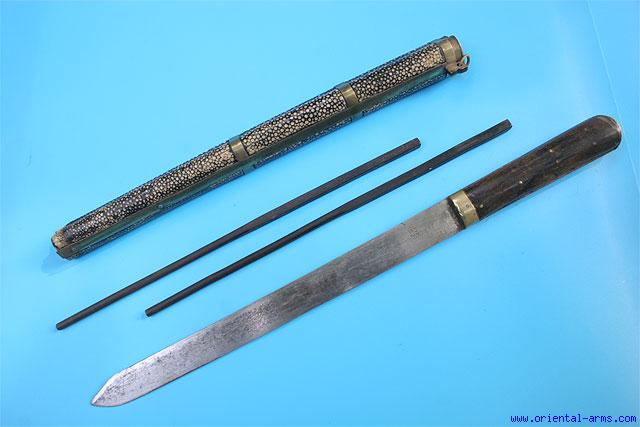 A Chinese ‘trousse’ (eating set), comprising a knife and chopsticks. This type of sets was very common in china and in all the countries under the Chinese influence from Tibet to Mongolia. It was part of a man formal dress up to the turn of the 20th century and usually accompanied with a variety of accessories like pickle spear, toothpicks, tweezers and the like. Similar sets are found in various sizes and quality. This one is of rather large dimensions with an 11 inches blade (compared to 6-7 inches blade in the more common ones). The blade is signed with a Chinese character. Horn grips and white metal pommel cover. Scabbard is wood covered with Sting Ray skin and brass mounts. Chopsticks are ebony. Total length 16 inches. Very good condition. Scabbard tip is missing. One of the chopstick was broken and re-glued. It is shown below next to a “normal size” 12 inches similar item. |