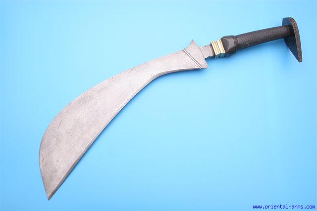 The Ayda Katti is the national sword of the Coorg of Malabar, the South West coastal area of India. It is one of the rarest swords in the Indian arsenal and of a very peculiar shape. It reminds in a way an agricultural tool, but it is a real weapon and a deadly one in the experienced hands. This one is rather big. The blade is of a sickle shape 18 inches long and 4 ½ inches wide at its widest point with a massive brass bolster. The handle is carved horn checkered around the grips area, with a kite shaped horn pommel. 24 inches total length. Very good plus condition. |