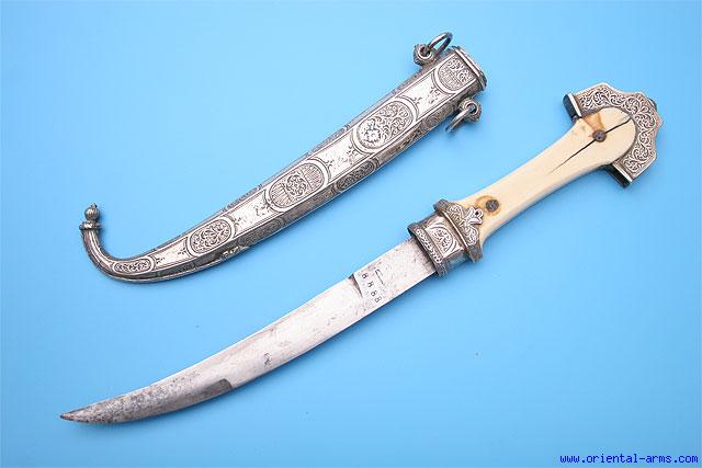 Up for sale is this fine Koumaya Dagger from Morocco. Classical blade of good quality, 8 ½ inches long, double edged at its lower half and single edged at the top. The blade is stamped 8888 with what might look as a maker mark. The handle is carved from elephant ivory and mounted with chiseled mounts. Silver scabbard, chiseled with Moroccan classical design. Total length 15 1/2 inches. Very good condition. Age crack in the ivory on one side of the grip. |