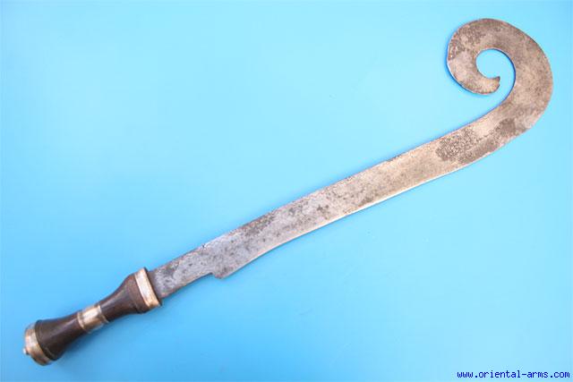 This unusual short sword is coming from West Africa, most probably of the Fon people of Dahomey (Today the Republic of Benin). Blade is 17 inches long up curving to almost a full circle at the tip. Wood handle with silver mounts. Total length 21 ½ inches. Very good condition. Lightly pitted areas on the blade. A rare sword. |