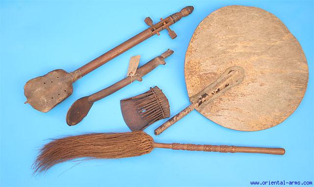 This lot of early 20 C. African day to day tools is not really weapons but a good examples of African work in wood and leather. It includes a hide made fan, a fly whisker, a string instrument based on turtle shell (string missing), a xylophone style musical instrument and a wooden spoon with a styled animal handle. All in very good condition and minor wood chips only. Of special interest is an old label attached to the spoon inscribed: SPO N.P.IND . |