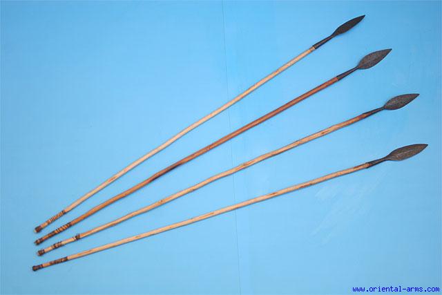 Up for sale is this lot of four arrows, African, mid 20 C. Steel heads 3 inches long, 1 inch wide with a 2 inches sockets. Wood hafts 27 inches long. Very good condition.