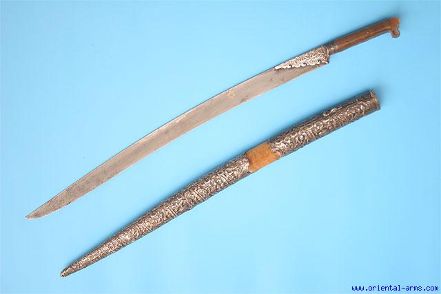 This rare form of Yataghan, with the lobed pommel is usually identified as North African, probably Algeria. In addition, most of these Yataghans will come with rhino horn hilt grips, as is the case here. Fine down curving blade, 25 inches long, forged from pattern welded (Damascus) steel in the pattern knows as Turkish Ribbon. In addition to the gold inlaid inscriptions there is a later etching in French : H. PHILIPPE A. SON AMI, BARRE, CALLOIS on one side of the blade and afrique 1830 on the other. The grips are rhino horn and the grip strap and bolsters are silver. The scabbard is mounted with big locket and chape of finely chased silver. Very good condition. Chipped pommel tips. |