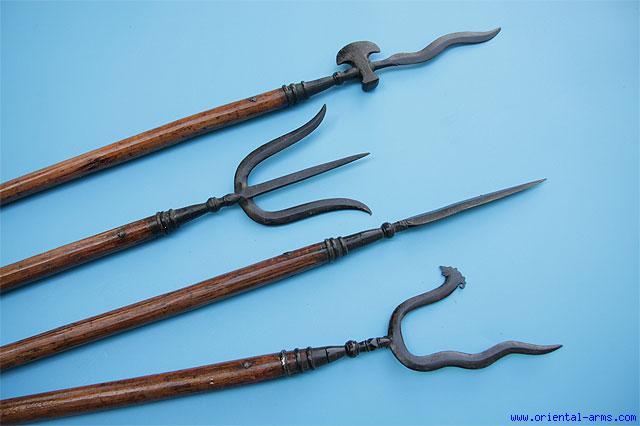 Up for sale is this lot of four spears, Chinese, late 19 C. Small size blades of different styles, 7 inches long plus 3 inches sockets, all painted black. Wood poles, cut short 18 – 23 inches long. Very good condition. Real weapons of high decorative value.
