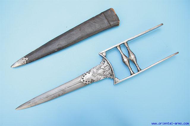 This Kattar push dagger is 18C. based on a secondary use of an earlier slightly curved dagger blade and forged from very good wootz (Damascus, watered) steel. The steel plate holding the blade are finely chiseled showing two dragon style creatures. Leather covered scabbard with silver tip. Blade 10 inches, total 17 inches. Very good condition.