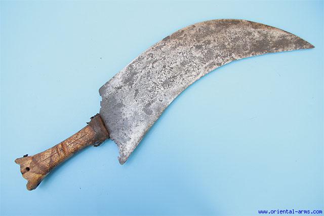 This heavy chopper is of unknown origin. Down curving blade, very sharp, crudely engraved and etched. Bone handle, Blade 12 inches long, 4 inches wide. Total length 17 inches. Good condition. Pitted spots on the blade and lightly chipped handle.
