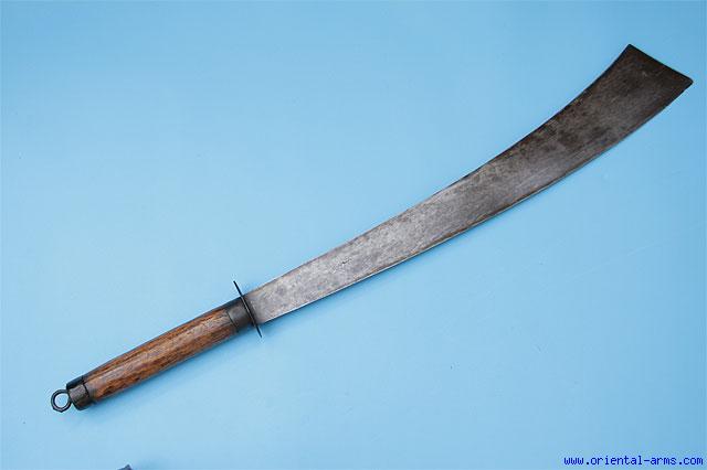 This heavy chopper is most probably of Vietnamese origin with strong Chinese influence, The up-curving blade is 22 inches long, 3 1/2 inches wide. The two handed handle is wood, 9 ½ inches long inches long, with steel mounts, ring pommel and polygonal cross guard. Total length 33 inches. Very good condition. |