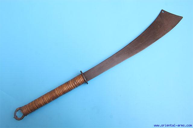 This heavy chopper is of Vietnamese origin with strong Chinese influence, The up-curving blade is 17 inches long, 3 inches wide lightly engraved. The two handed handle is wood bound with rattan, 10 ½ inches long inches long, with steel mounts, ring pommel and oval shaped cross guard. Total length 28 inches. Very good condition. |