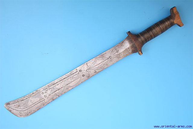 We are not sure with the origin of this unusual machete / knife, but the turned wood handle with brass wires and the decoration style on the blade suggest African origin, may be east Africa. The heavy blade with the edge on the convex side is 13 ½ inches long beautifully engraved with geometrical design. The handle is turned wood bound with brass wires. Total length 18 inches. Very good condition. Part of the pommel disk is chopped. |