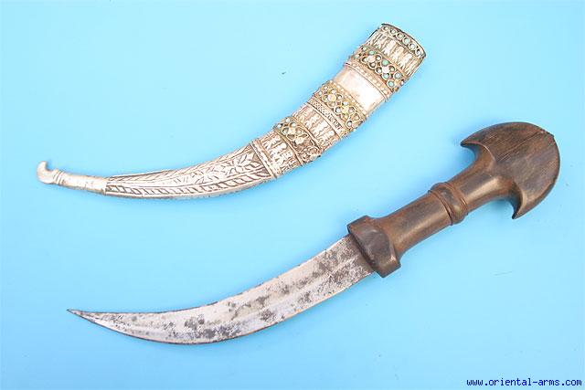A very good example of a Jambiya dagger from Iraq, most probably from the South, Basra area. The deeply curving blade is 7 ½ inches long, with a flat diamond cross section. The hilt is carved from a solid piece of horn with a flared down curving pommel corners. The scabbard decorative chased silver set with turquoise stones . Total length 15 inches. Very good condition. Minor pitted spots and blackened areas on the blade. Few turquoise stones are missing. |