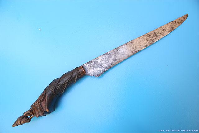 This unusual knife is of Hindu origin, probably Indonesia but may be Sri Lanka as well. The blade is 7 ½ inches long, single edged. The handle is wood, bound with lacquered fibers and the pommel is carved in the shape of Ganesh , the Hindu elephant god with traces of gold paint. Total length 13 inches. Very good condition. Blackened spots on the blade. |
