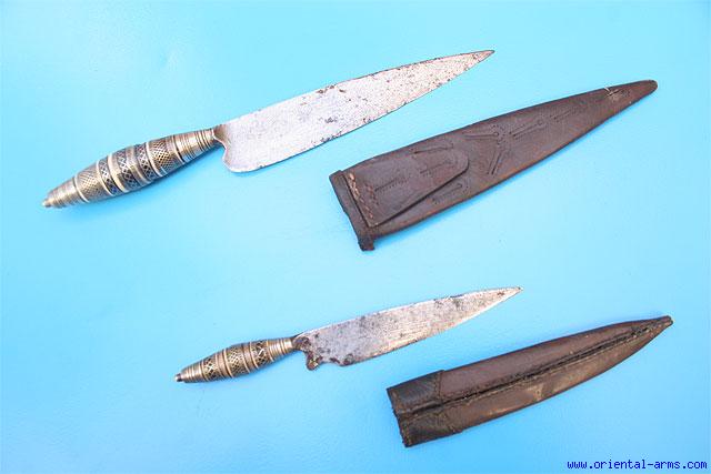 Up for sale is this set of two knives from the Canary Islands in the Atlantic ocean. Single edge blades 5 1/2 and 4 inches long with dot punched decoration on the one side. Hilt composed of alternating discs of horn bone and brass. Original leather scabbards. Total length 9 1/2 and 6 1/ inches. Very good condition. The seam of the small knife scabbard is open. |