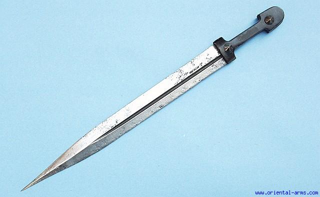A Kindjal dagger from the Caucasus. 15 ¼ inches long blade with classical off centered fullers, signed with a maker sign. Good horn grips with big nicely shaped rivets. No scabbard. Fair condition, several areas of pitting on the blade. It is offered here in a surprising price. |