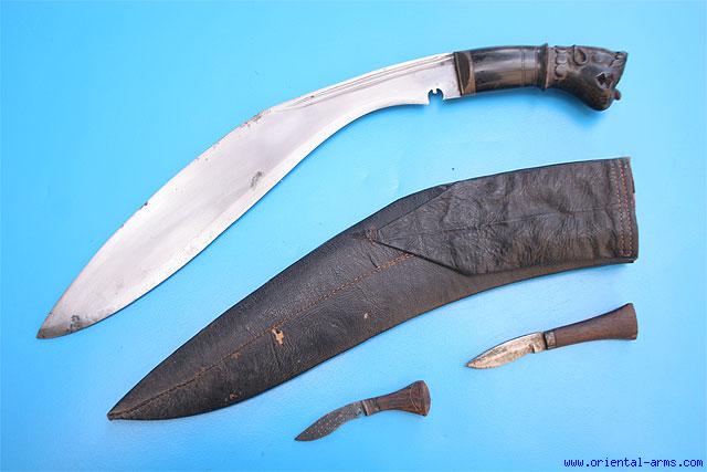 From Nepal, mid 20C., 1950 or around comes this impressive Khukuri knife. Well shaped and well forged blade, 14 inches long, hollow ground with two fullers and ridged spine. Black horn grip with the pommel shaped like a lion head. Brass bolsters. Classical shape leather covered scabbard with accompanied knife and steel (Karda and Chakma) with wood grips. Total length 19 ½ inches. Very good condition.