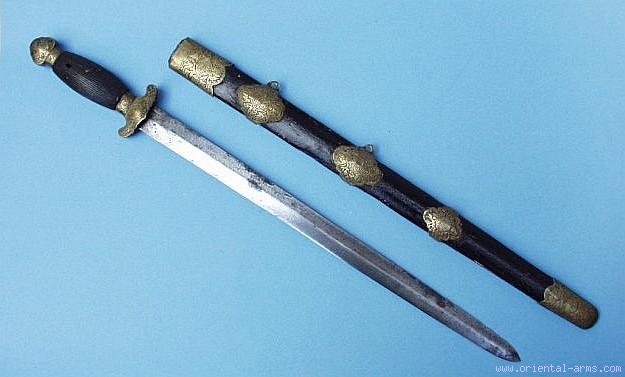 This is a short Chinese straight sword Jian from the late 19 or early 20 C. The straight blade of flat diamond cross section is 18 ¼ inches long. Ribbed wood grip, beautifully engraved brass fitting on black painted wood scabbard. Good condition. Very Attractive Price.