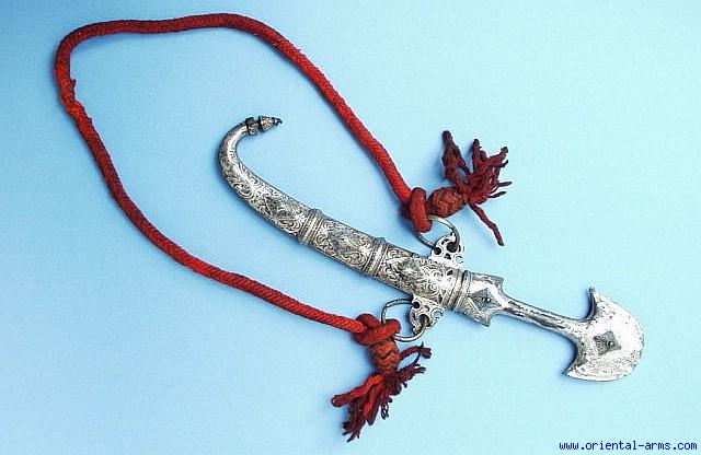 The Moroccan version of the Arab Jambiya dagger is locally called Koumaya and characterized by a slender blade, usually dual edged at its lower half and single edge at the top. There is a big variety in the decoration styles and quality of the handles and scabbards. This one is of a better quality than average, with a good 8 1/2 inches blade, The hilt is of the style is known as: Chapeau de Gendarme (The hat of the policeman) because of the shape of the 3 ½ inches wide pommel. The hilt and the scabbard are of highly engraved and enamled silver on a brass background. This piece comes with its original red baldric belt attached to the big side loops on the scabbard. Good condition. Some of the silver and enamle has disapeared but it is still an extremely attractive piece. |