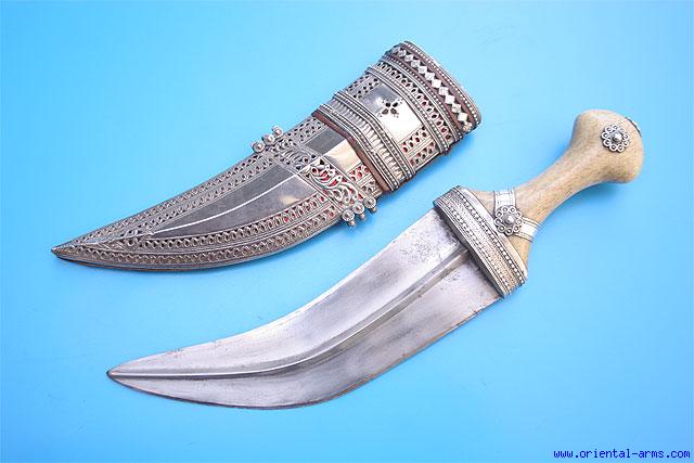 This very fine Jambiya dagger is Yemenite, from south Yemen, mid 20 C. Good blade, 8 inches long, 2 ¼ inches wide with a pronounced central rib. Very nice bone grip with silver mounts. Whole silver scabbard. Total length 13 inches. Very good plus condition. A very fine item in excellent condition. |