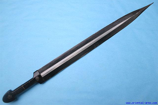 This very good long Kindjal dagger is of interesting shape: Blade 19 ½ inches, diamond cross section acute tip and with originally blackened edges. The blade is signed in Arabic letters and dated to 1320 (1902 in the Gregorian calendar). Black horn grips with brass separator and pyramid shaped rivets heads. Total length 25 inches. Very good condition. The original blackening of the edges is almost intact. |