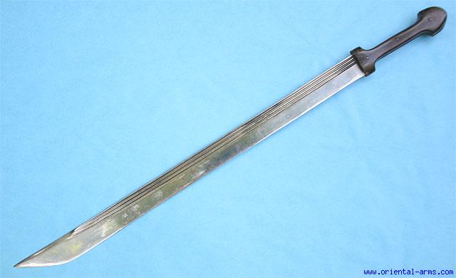 This sword is of Persian origin and it is also known as Quadara. A similar sword is found in central Asian countries and in the Caucasus but sometimes called Qama. This specimen has a 23 1/2. inches long slightly up-curving and single edge blades with a 4 inches false edge. The blade is fullered with inscriptions and engarving. Dated 1310 (1892 in the Gregorian calender). Black baffalo horn grips mounted with three iron rivets . Total length 29 1/2 inches. Very good condition. No scabbard.