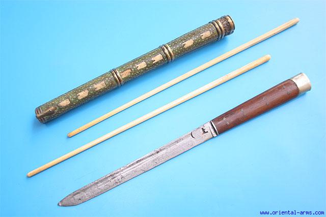 A Chinese ‘trousse’ (eating set), comprising a knife and chopsticks. This type of sets was very common in china and in all the countries under the Chinese influence from Tibet to Mongolia. It was part of a man formal dress up to the turn of the 20th century and usually accompanied with a variety of accessories like pickle spear, toothpicks, tweezers and the like. Similar sets are found in various sizes and quality. This one is a good quality one. The blade is 7 1/2 inches long laminated and fullered with maker mark stamp. Green died ray skin cover inserted with ivory images of animals. wood handle with white metal pommel. Very good condition. Total 13 inches. Blade slightly over etched. One ivory animal image is missing. |