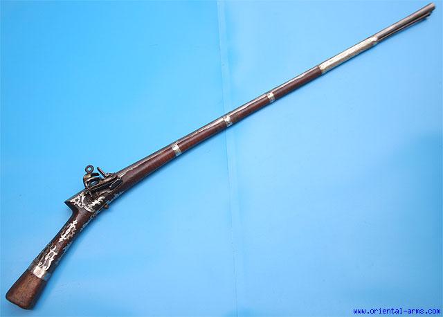 Up for sale is this Miquelet gun, late 18 – early 19 C. Turkish origin with typical Miquelet lock in good working order. Barrel made from twisted steel, marked with gold maker and bound with engraved silver bands. Stock inlaid with silver inserts. Barrel 39 inches, total 51 ½ inches. Original steel ramrod. Very good condition. Minor losses to the silver inserts and minor chips on the wood parts. |