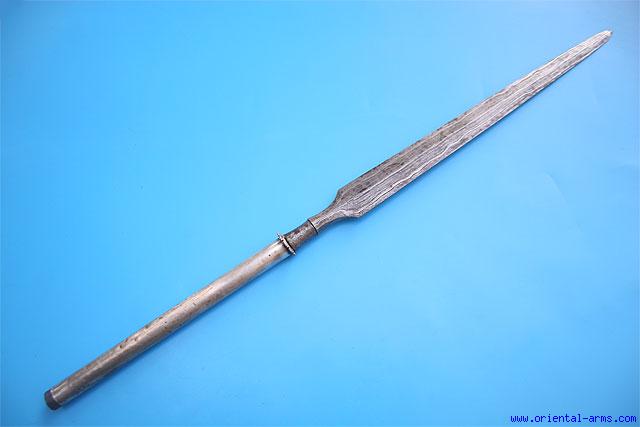Very Good, Late 19 C. Indonesian spear, with finely laminated pamor blade 18 inches long. Silver sleeve 10 inches long. Wood haft, unfortunately cut short. Total length 29 inches. Very good condition.