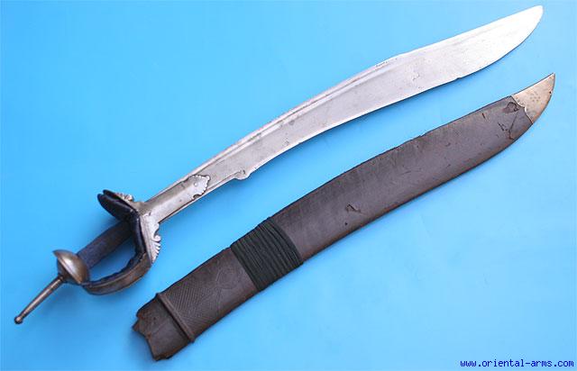 This massive sword is Indian, late 18 – early 19 C., probably Central India. The heavy blade is 28 inches long, almost 3 inches wide at it maximum width and with a 10 inches back edge. Basket hilt in the style known as “Khanda” Type hilt and with a 3 ½ inches pommel spike. Velvet covered grip and hand cushion (partially restored). Original wood scabbard covered with leather, finely tooled at its upper part and mounted with a brass chape. Total length 38 inches. Very good condition. Slightly damaged and partially opened scabbard at its back. |
