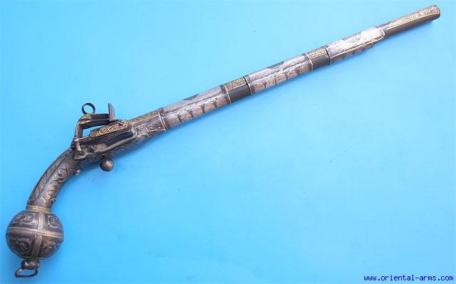 for sale a fine Caucasian miquelet pistol mid-late 19C. Slender barrel with smooth bore in 13,5 mm calibre. Rich golden floral inlays and silver nielloed barrel bands. Maker's mark on the barrel tang in Arabic letters. miquelet lock in good working order with rich gold inlay. Nielloed silver mounts with spherical butt end with lanyard ring. Very minor dents and damages to the silver bands. Ramrod missing. Barrel 14 1/2, total 19 1/2 inches. |