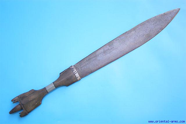 This unusually long Billao dagger is late 19 Century and comes from the coastal people of Somalia. It has a classical non-symmetrical leaf shape blade, 14 inches long (compared to the 7-8 inches blade in the more common Billao daggers). The handle is made of two horn sectors separated by steel. The pommel cap is classical three prong pommel. Total length 22 inches. Very good condition. Fine age patina on the blade and handle. Minor edge nicks and a very small repair on the horn. No scabbard. To demonstrate the size, it is shown below next to a more common Billao with a 8½ inches blade. |