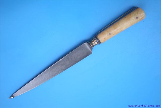 This fine Kard knife is Persian, late 18C. Massive 9 inches long, 10 mm thick blade with a swollen tip for armor piercing, forged from fine wootz (Watered, Damascus) steel with high contrast. The steel bolsters are inlaid (true inlay) with gold decoration. Walrus ivory grips and steel grip strap. Total length 14 inches. Very good condition. No scabbard. |
